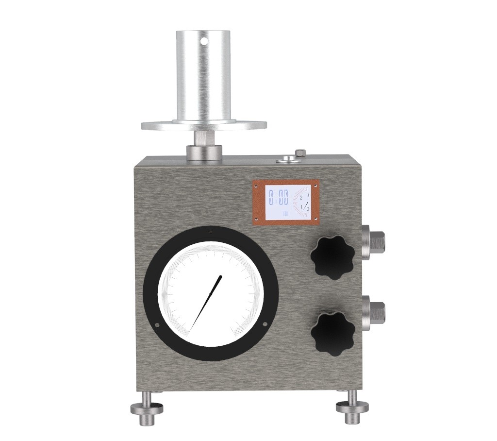 一體化結(jié)構(gòu)設(shè)計(jì),方便野外使用。活塞單元、壓力容腔、液/液分離器(對(duì)于氣體檢漏為氣/液分離器)、精密壓力表(數(shù)字壓力表可選)、螺旋調(diào)壓泵、壓力傳感器、位移傳感器、溫度傳感器和所有閥門均安裝在一個(gè)精加工的鋼質(zhì)金屬機(jī)殼內(nèi)。儀器帶有四個(gè)調(diào)平腳,用于儀器的調(diào)平。